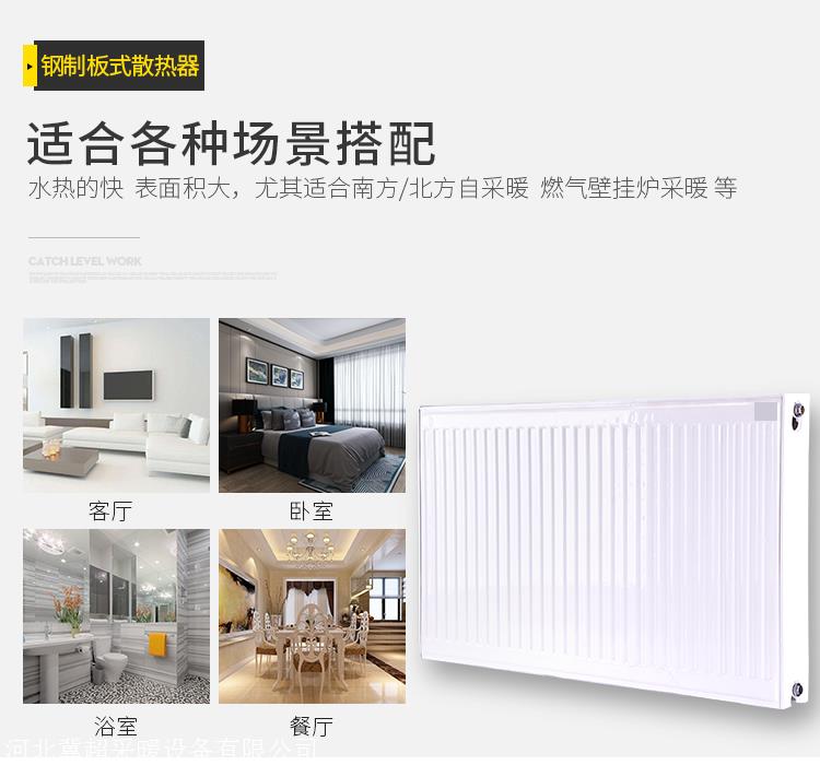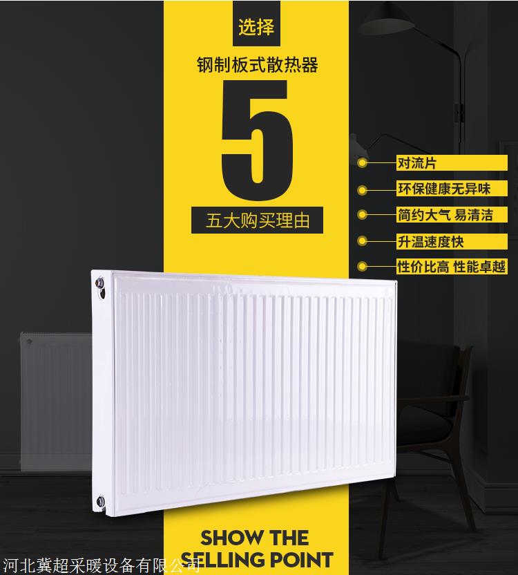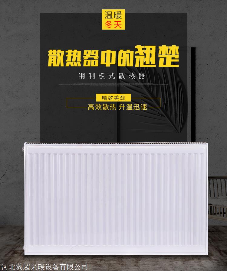 产品详情:钢制板式暖气片钢制板式暖气片是现代新型高效节能采暖散热器,以优质的冷轧低碳钢为原材料,在我国特别是南部具备大量的用户,作为高效的加热装置,钢制板式暖气片获得了人们的广泛青睐。它可以充分发挥迅速取暖,舒适取暖和现代居住地中家具的机能。它已成为多种类型暖气片中高效供暖的楷模。独特的对流散热片设计加强了室内空气流通并具备不错的散热效果。在低温和开水的室内采用舒适;体积较小,减小了室内空间占用,提高了房间利用率。外形优雅大方,外观简练超薄,装饰力强。从结构上看,钢制板式散热器分成四种类型:单板单对流,双板单对流,双板双对流,三板三对流。