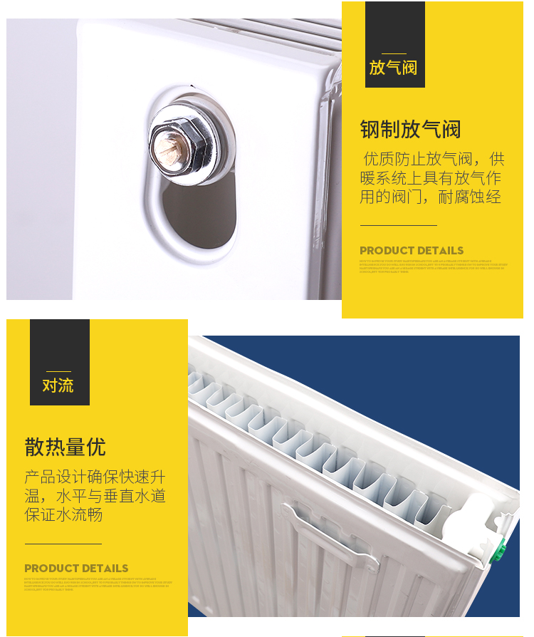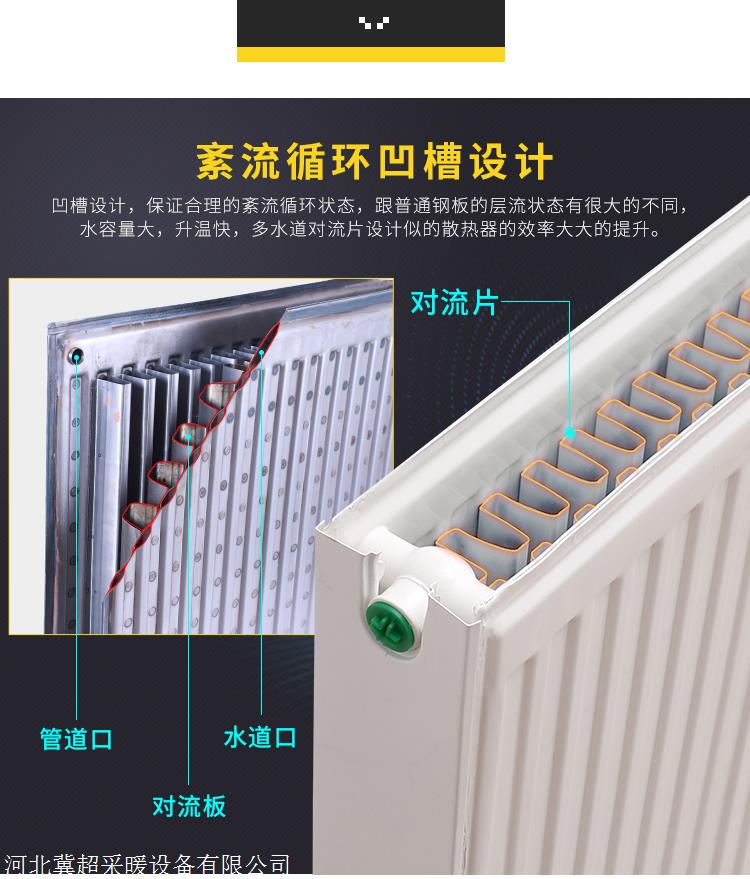1.钢板散热器由优质冷轧低碳钢制成。内部装有独特的导流片。水路多,排列均匀。有效散热面积大,散热效果好。空气对流流量大,散热速度快。,对流效果显著。一般来说,钢制散热器的加热效果要好于其他类型的散热器。