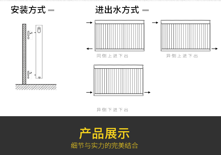 5.规格多样,安装简便。高度从300mm-900mm,长度从400mm-3000mm,厚度从45mm-160mm。规格和型号完备,可以满足不同房间的需要。为便于安装,散热器附有了支架和紧固件,还可以选项落地支架将散热器安装在地板上。